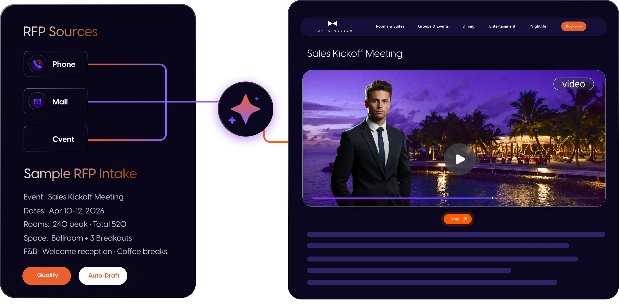 Cvent, email, & phone RFPs scatter across systems while high-value planners wait. Competitors respond while you're still consolidating.